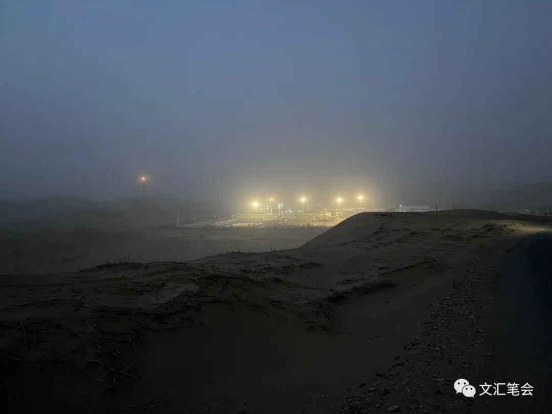 而在道路的这一头,是漫漫的沙海,是沙海里的气井,二十三口气井正在从地底源源不断地输出天然气;是沙海之中的飘摇的一叶小舟,是一位位石油工人在大漠深处的日夜晨昏。