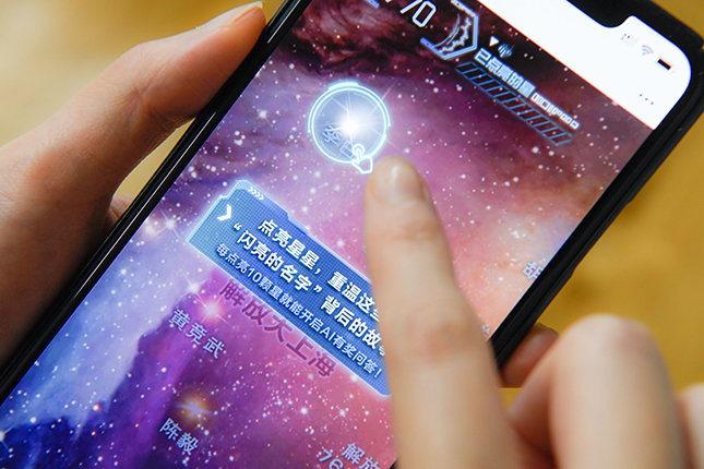“漫游星空”随机线路中,主页面的璀璨星空上,有70颗未点亮的星星、70个交替出现的“闪亮的名字”。用户左右滑动页面,在星空中漫游观展,随机点击星星后,会弹出绚丽的人物页面,星星随即被点亮。