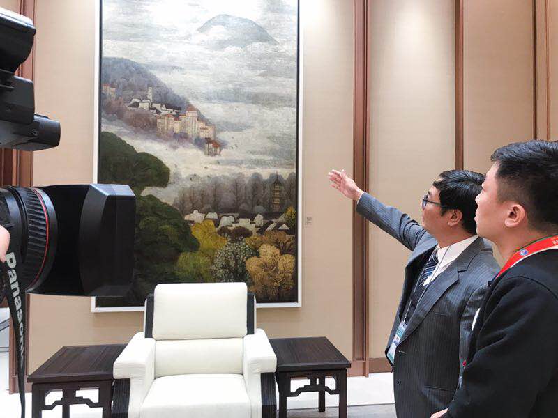 漆画《春和景明》放置在进博会主会场中方领导人休息室。画作长1.7米,高2.9米,采用全景式构图,祥云缭绕,水天一色,“三山两塔”、大榕树,以及白墙灰瓦马鞍墙头等众多福州元素尽收眼底。这是首届中国进博会福建省唯一一幅入选到国家会展中心(上海)的漆画作品。