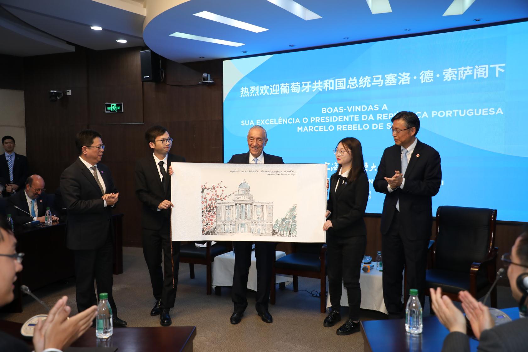 在上外,德·索萨总统与葡萄牙语专业师生进行了亲切交流。他对上外学子现场表演的葡萄牙经典诗歌朗诵、传统民谣fado经典曲目演绎深表赞叹。他还向上外葡语专业教师以及在中小学教授葡语的教师表示感谢。交流中,葡萄牙语专业学子向总统赠送了自己创作的上外校园景色画作。