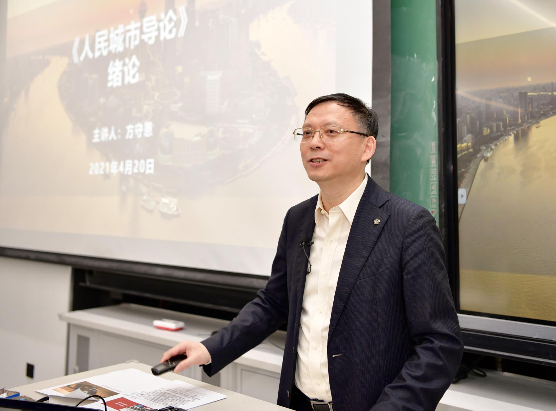 在今天的“人民城市导论”第一课上,方守恩从人民城市的理论缘起、人民城市的本质属性、人民城市的价值取向三个方面展开。他从城市的产生说起,阐述了我国城镇化发展经历的主要四个阶段,并联系实际指出我国城镇化在快速发展中出现的矛盾和亟需解决的问题。