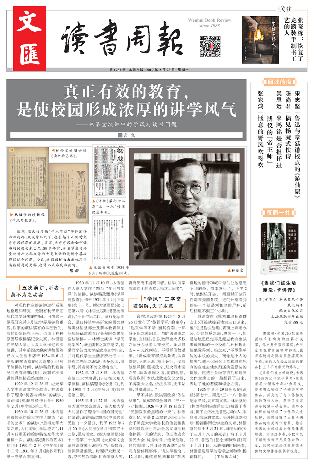 今日文汇读书周报刊发《真正有效的教育,是使校园形成浓厚的讲学风气》。近期,翟天临涉嫌“学术不端”事件闹得沸沸扬扬,众说纷纭之下,也引起了人们对大学学风问题的反思。其实,大学学风和如何读书的问题由来已久,80多年前,著名学者林语堂就曾在光华大学和大夏大学的演讲中屡次提到这个问题。今天,我们回过头来看他对于这些问题的见解,也许不无启发和共鸣。>>详情