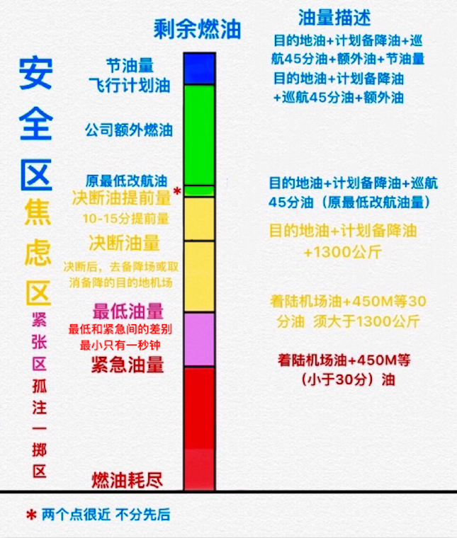 在民航圈的副驾驶手里,流传着一张燃油决断“宝典”——这张图用不同颜色标出剩余燃油量计算公式、油量多少与航行关系等……如果有飞行计划油和公司额外燃油,那就处在飞行“安全区”;如果只有最低油量,那已是飞行“紧张区”;如果油量紧急,那就进入最危急的“孤注一掷区”,最低和紧急油量的差距最小就在一秒之间!