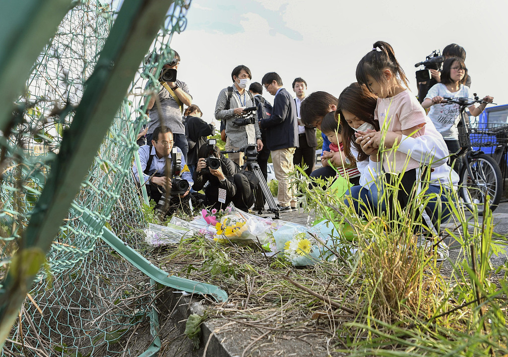 人们带着鲜花来到事故现场悼念遇难的孩子。| 视觉中国