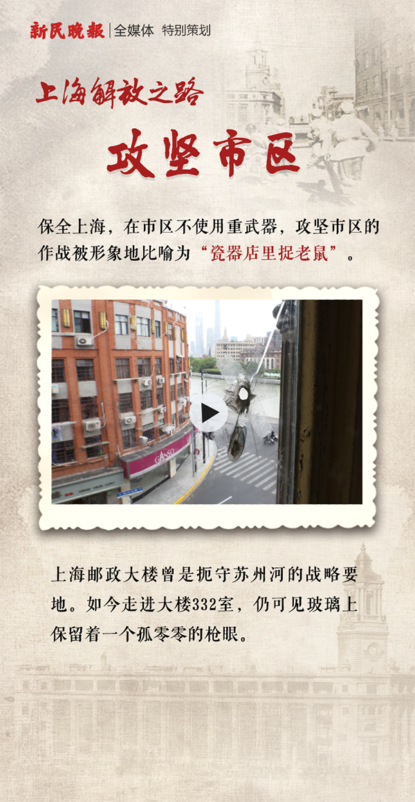 上海邮政大楼的玻璃窗上,留有一个“永不修复”的弹孔。市区攻坚战,因不能使用重武器,“是用人拼上去的”。
