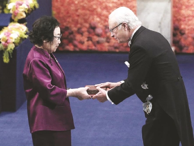 ▲2015年,瑞典国王为屠呦呦颁发诺贝尔生理学或医学奖。