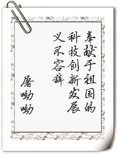 ▲屠呦呦寄语:“奉献于祖国的科技创新发展义不容辞”。