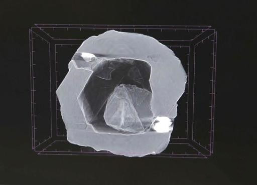 专家发现,尽管这颗“钻中钻”结构复杂,但重量仅为0.62克拉(0.124克),最大尺寸为4.8 x 4.9 x 2.8毫米。内部空腔体积为6立方毫米,内部晶体体积为1.6立方毫米,估计重量为0.02克拉(0.004克)。内钻石呈板状,尺寸为1.9×2.1×0.6毫米。