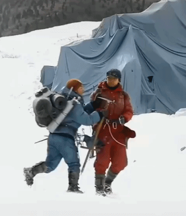 胡歌之前在《攀登者》拍摄现场,一位疑似章子怡的女演员穿着冬装从远处跑过来轻推了一下胡歌,同样身穿冬装的胡歌十分顺势地倒在了旁边的雪堆里,造型优雅又搞笑。