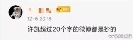 12月6日,许凯发了一段非常很励志的话语,结果却被粉丝无情揭底——许凯所有超过20字以上的微博都是抄的。