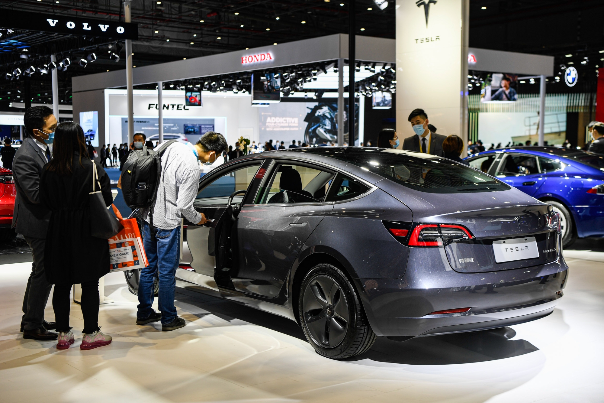 ▲最熟知的新能源汽车之一特斯拉展台,不少观众驻足询问。