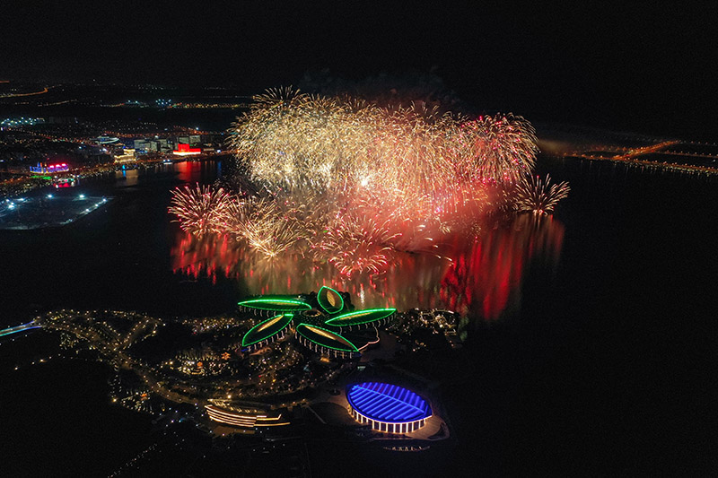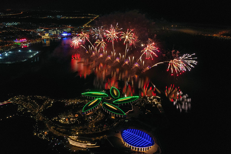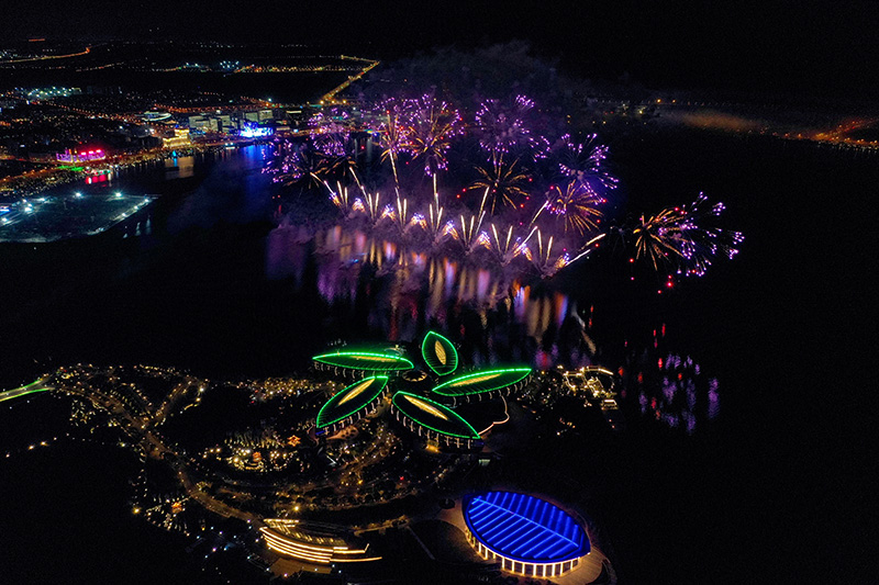 烟花与湖水交相辉映,舞动出美轮美奂、祥和繁荣的人间美景,彰显出上海的开放与包容、浦东引领区的创新与发展、临港新片区的年轻与活力。东海之滨的临港主城区,满怀热爱与祝愿迎东方潮涌。