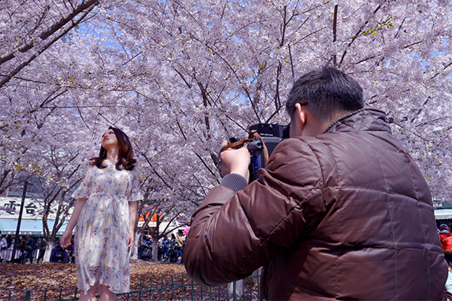▲不少游客专程前来与樱花合影