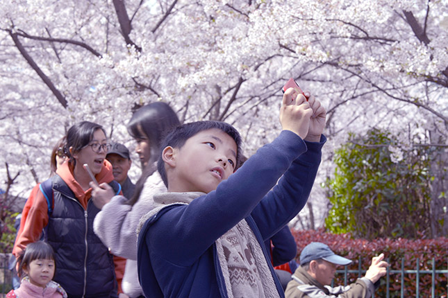 市民游客们沉浸在上百株染井吉野樱花树全面盛放的壮美景观中流连忘返。