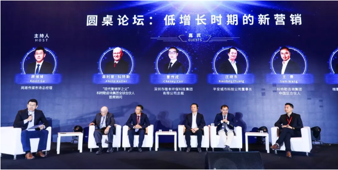 在峰会圆桌论坛上,平安城科董事长庄晓东与“现代营销学之父”菲利普?科特勒、科特勒咨询集团中国区合伙人王赛、梯影传媒创始人兼CEO任斌、深圳市植本环保科技集团有限公司总裁曹传成共同就“低增长时期的新营销”这一主题展开探讨。