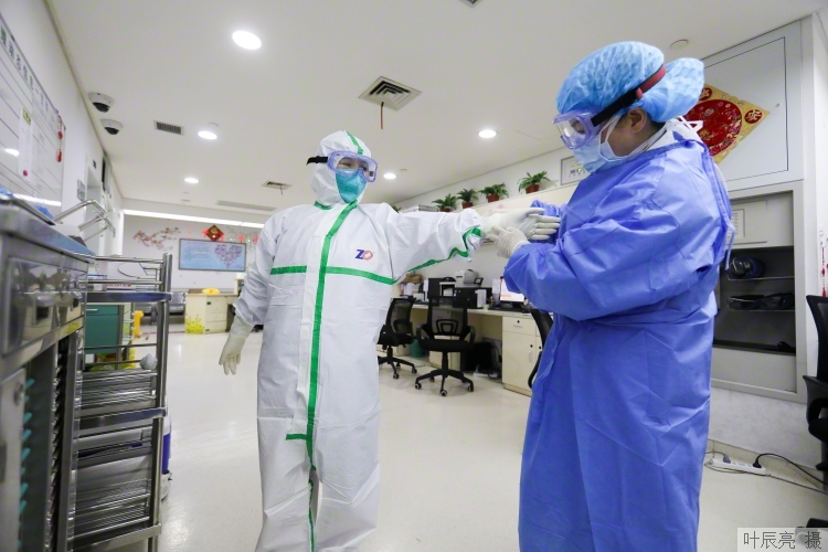 ▲在上海仁济医院发热门诊,医护人员全服武装接诊病患