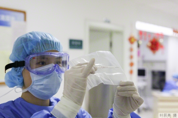 ▲疫情当前,即使是一支小小的体温计,医护人员在查看时仍要做好防护