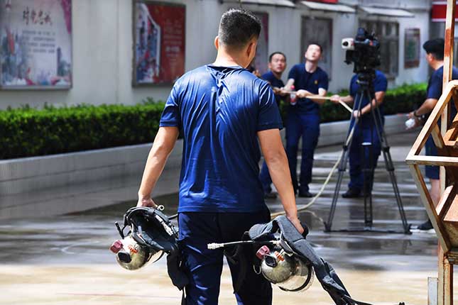 ▲高温下消防员们每天都要提着救火装备负重来回奔跑训练。