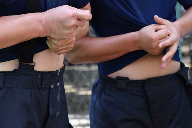 高温骄阳之下,厚实的灭火战斗服虽然能够为消防员提供保护,但一天是忙碌下来,数不清要出几身汗,棉质的战斗服湿了干、干了又湿。