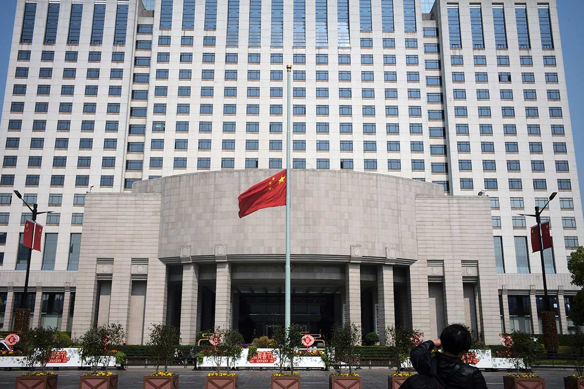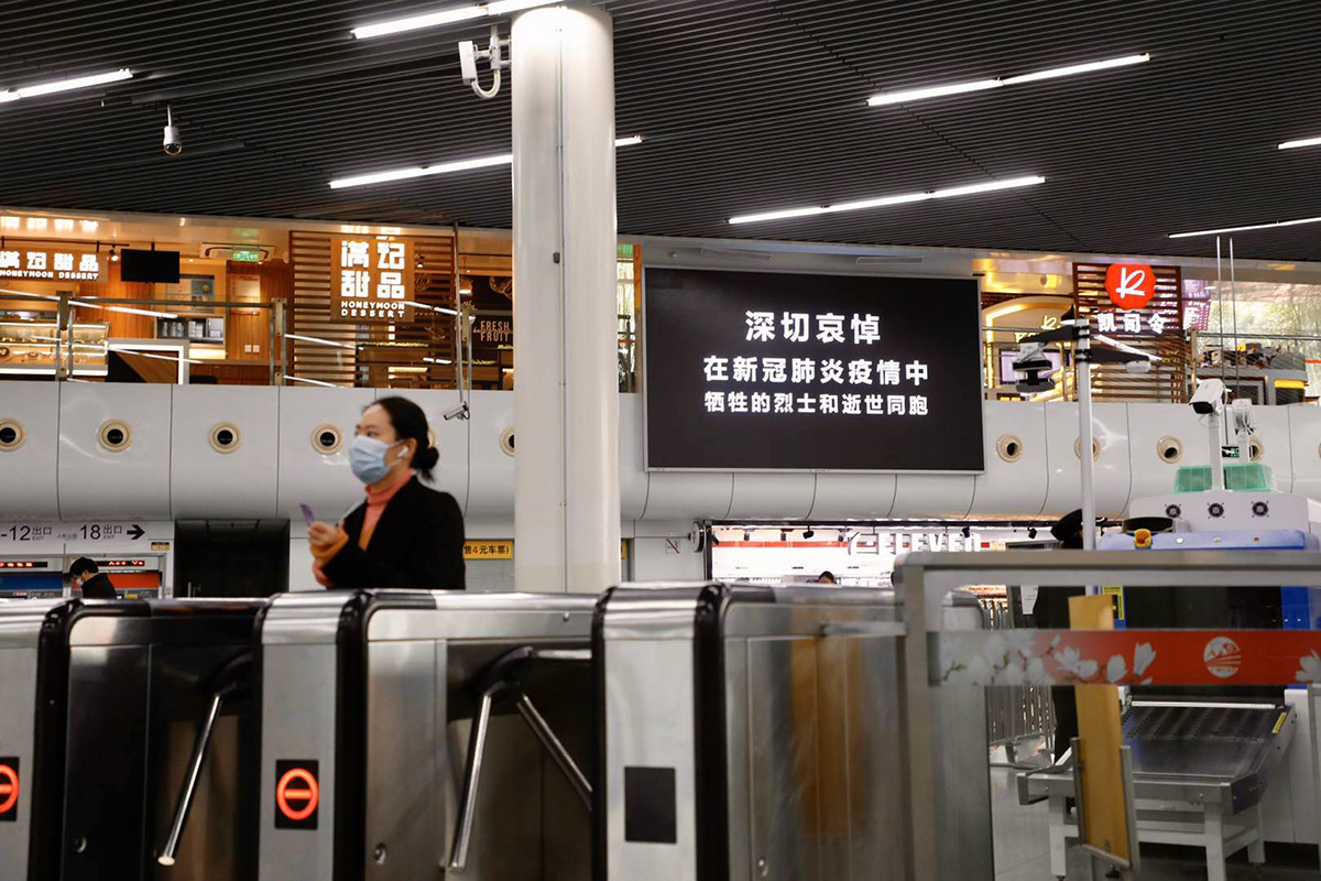 △上海人民广场降半旗,向抗击新冠肺炎疫情斗争牺牲烈士和逝世同胞志哀