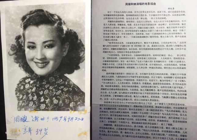 因北京报刊通过“上影”介绍要采访周璇的历史。我已婉言回绝。后来国际电影节在赵丹寓所揭牌仪式,要我代表艺术家发言,于是又想起周璇,故写了《周璇和她演唱的电影插曲》,不用也罢,请予扔还为感。