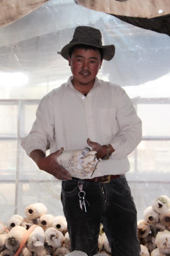 41岁的巴顿一脸的憨厚。几年前,县科技局推广菌菇生产,好学的巴顿学会了这门技术,成为村里两名科技特派员中的一员。起初从拉萨买回菌棒,因为路途远、运费高且损耗较大,他就慢慢琢磨,自己成功培育菌棒,成为远近闻名的菌菇生产专业户。去年,他菌菇生产收益八万多元,加上自己经营一个小施工队,衣食无忧。今年,在县里的引导支持下,巴顿办起了食用菌种植合作社。县里投入50万元扶贫资金,县科技局投入110万元设备,巴顿自己出资80万元,贷款150万元,建造了村口的这幢两层的建筑。竣工后,这里将成为菌棒车间和灭菌车间,旁边还要建温室大棚,总占地面积达七亩。合作社将为15名贫困建档立卡户的村民提供就业,吸收至少30名失去劳动力的村民入社。