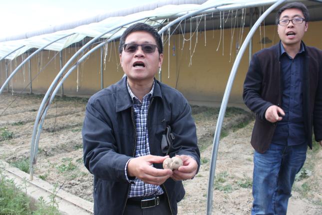 院子里有五个温室大棚,里面齐整地码放着几千株平菇菌棒。巴顿在这里捣鼓菌菇生产已有四五年的时间了。