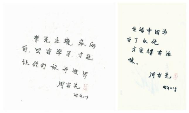 作为宝山人,我关注着和故乡相关的人与事,周有光、张允和与宝山的邂逅,涌起我内心的波澜,甚至骄傲。很感谢我的朋友老冯,让我读到了周老111岁高龄时写下的这些珍贵稿件。前两年朋友经老作家屠岸———屠老先生近一个月前也仙逝了———介绍认识了周有光先生,屠先生说,“周有光是我的表哥”,这让朋友大为意外。当他拿着屠先生的字条敲开周老家大门时,同样涌起了内心的波澜,可是眼前的老人平易和蔼极了,与他风声雨声读书声无声不闻,家事国事天下事无事不论。自此他成了周老家的常客,进而成为忘年交。周老信任这位比自己小了六十多岁的朋友,正是缘由他的建议,周老断断续续,用颤抖的笔触追忆张允和,于是有了《张允和送的手表》 《旧扇记》 《锡炉记》 ……张允和的去世曾给周老带来巨大的精神打击,慢慢地,隔了半年才恢复平稳,他对屠岸说:“人的死亡,是为后来者腾出生存空间,使人类在世界上生生不息。”屠岸在给友人的信中谈到周老这句话,他称自己的表哥是人类第一“通人”,因为他的话勘破了生死的秘密,阐述了宇宙的规律:“他的观点,是在生死观、人生观、宇宙观上对今天我们的最高启示,也是终极关怀。”但读了其手迹中诸如此类的文字:“追忆与允和的过去,回忆起举杯齐眉的日子,满目孤独,满心感伤,无言以对,泪流千行。”我想十多年前周老未必真走出了悲痛,伤口太深太狠,或许他只是在努力捂住伤口而已,他写道:“张允和已经成为了我生命中的一部分,虽已远去,依旧在我心间。”