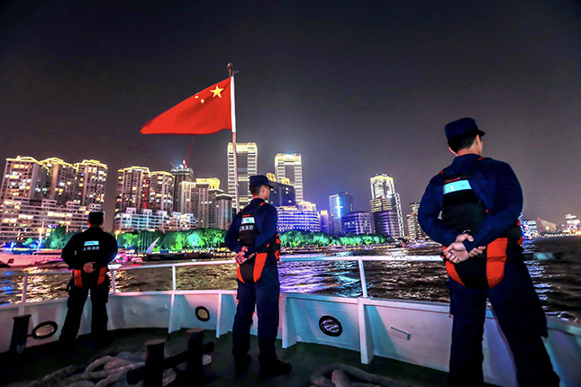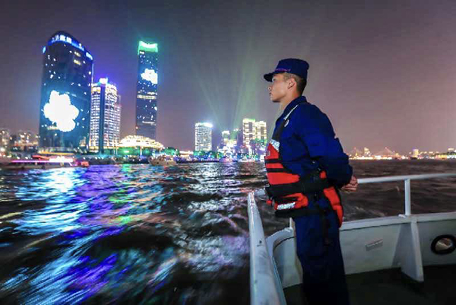 国庆中秋长假,上海市消防救援总队水上支队指战员驾驶“沪消3号”船在黄浦江外滩水域巡察,为浦江灯光秀保驾护航。