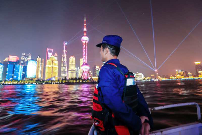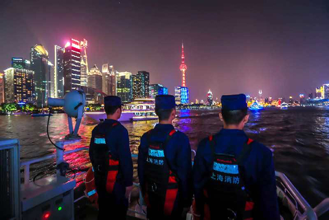 美轮美奂的浦江灯光秀近在眼前,消防指战员却没有闲情去欣赏,而是坚守在消防船艇甲板的岗位上,为节日社会面防火安全尽职。