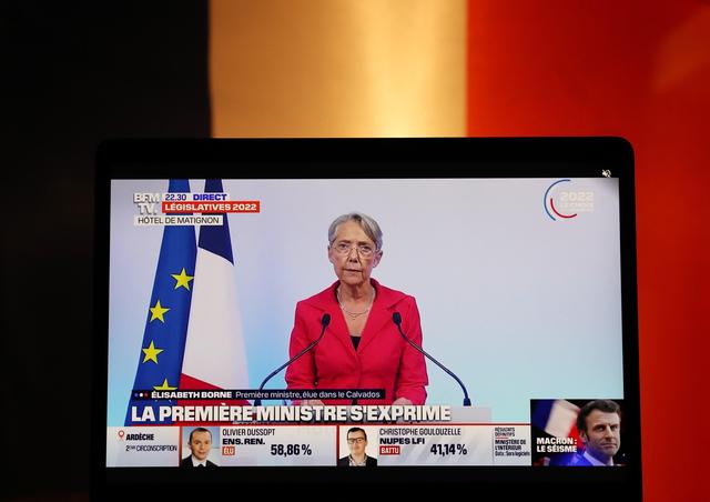 ▲6月20日的视频画面显示,法国总理博尔内选后在总理府召开新闻发布会。