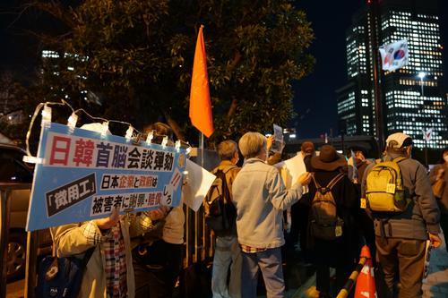 ▲3月16日,抗议者在日本东京首相官邸前抗议日韩首脑会谈。