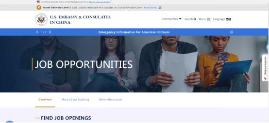 图片说明:美国驻华大使馆和领事馆网页上有关申请使领馆工作的网页截图。
