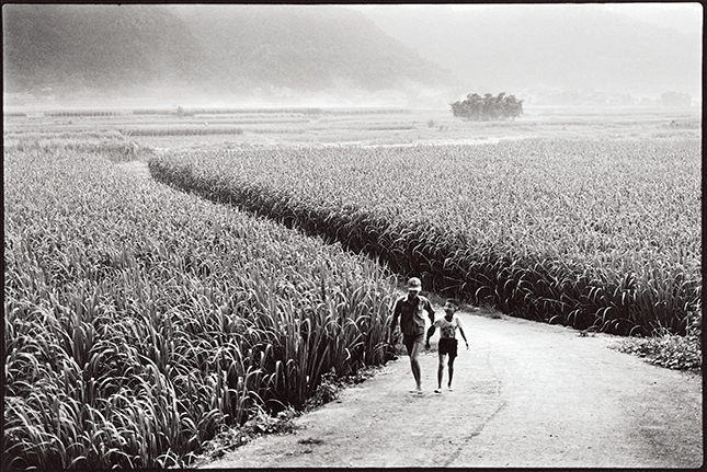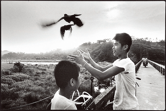 展览中有这样一张照片:远方有山,雾气朦胧,一对小兄弟,赤脚奔跑在田间小路上。照片名为《埔里的两兄弟》,拍摄它时勾起了阮义忠的童年往事。那年阮义忠刚学会骑脚踏车,六弟硬是跟在后头追,个子那么小,一会儿就上气接不到下气地喘个不停,直嚷着要阮义忠停下来载他。阮义忠只得答应让他边跑边跃上后座,当时,六弟打着赤脚,大脚趾竟被车链绞进了齿轮的铁牙当中,鲜血直流。阮义忠说,如今回想起来,弟弟的惨叫声仍在耳畔回响。当时的他更是慌得如同千斤重担压在身上,连车带人瘫在地上。后来他扶着单脚撑跳的弟弟,半步半步地挨到家。1979年,阮义忠在南投县埔里镇拍摄时,一对小兄弟迎面而来。哥哥挽着弟弟的手,呵护的模样打动了他。“人要受伤才会长大,也才会懂得宽恕!我们曾没穿鞋子,一路走来……”阮义忠说。
