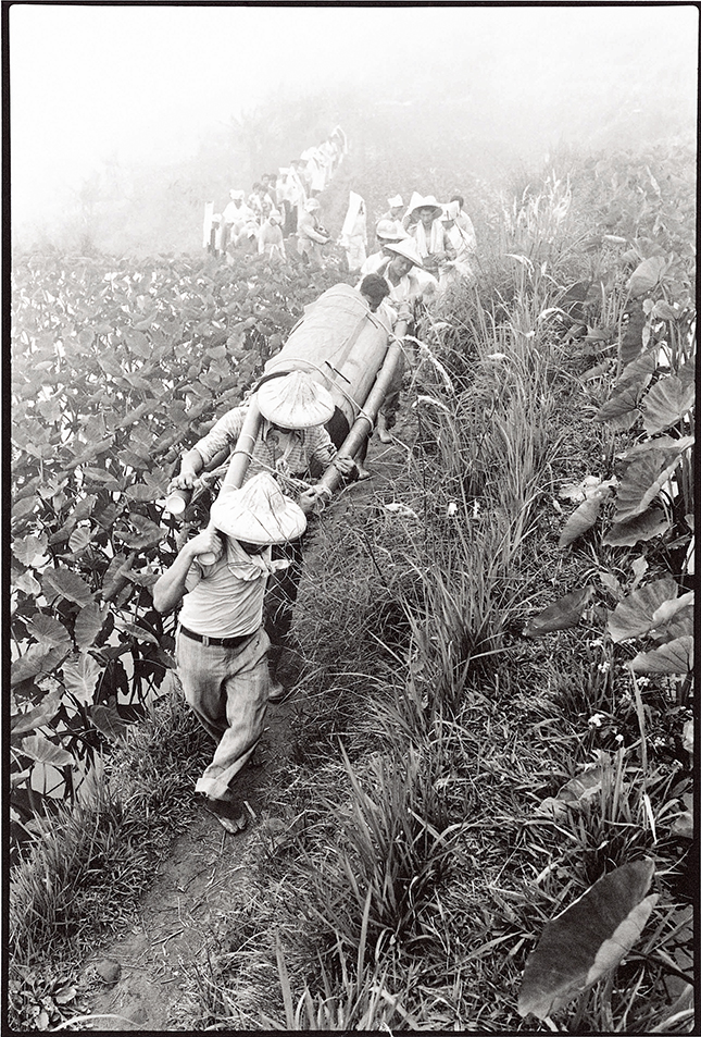 22岁,阮义忠生平第一次拿起相机,站在街头,透过观景窗看世界,站在正中午的烈阳下,却冷汗淋漓、惊慌失措,迟迟按不下快门。“每个人仿佛都在问,你和我有何关系?为何要拍我?你要表达什么?”阮义忠说:“摄影技术再怎么好,没有内容,就是‘匠’,有内容、有思想,才是‘师’。”“人与土地”系列想要表达的是人在土地上的生老病死。本次展出的《长白山上的日落与日出》记录了台湾农村出殡的场景:抬棺的只有四人,领头的人步伐矫健灵活,随时因地形而调整跨距,他的肢体有一种沉重无比和轻盈极了的绝妙平衡;因为落脚处实在太窄,于是每一步都得交叉腿走。“真美啊!这是我见过最美的舞姿之一:生者与死者共乘在云深不知处当中。”阮义忠感叹。