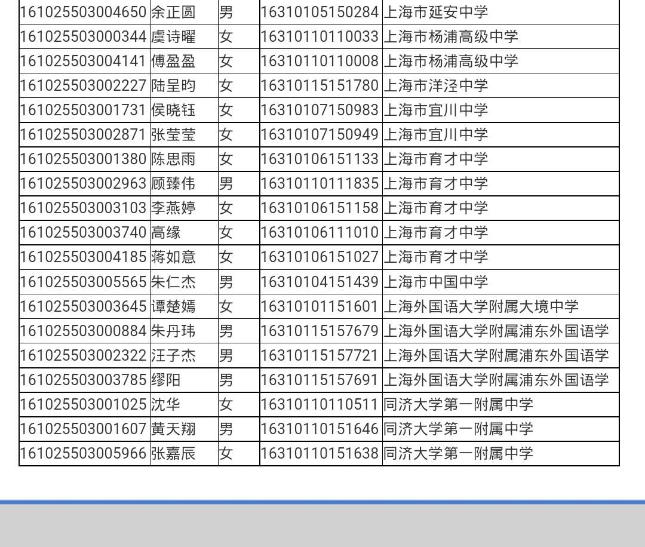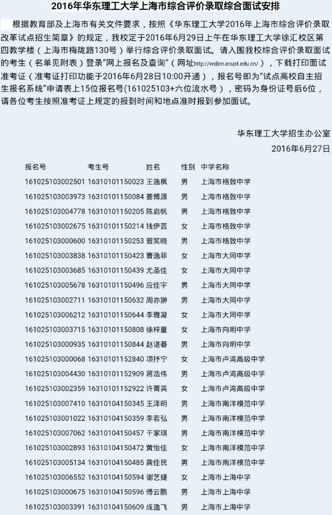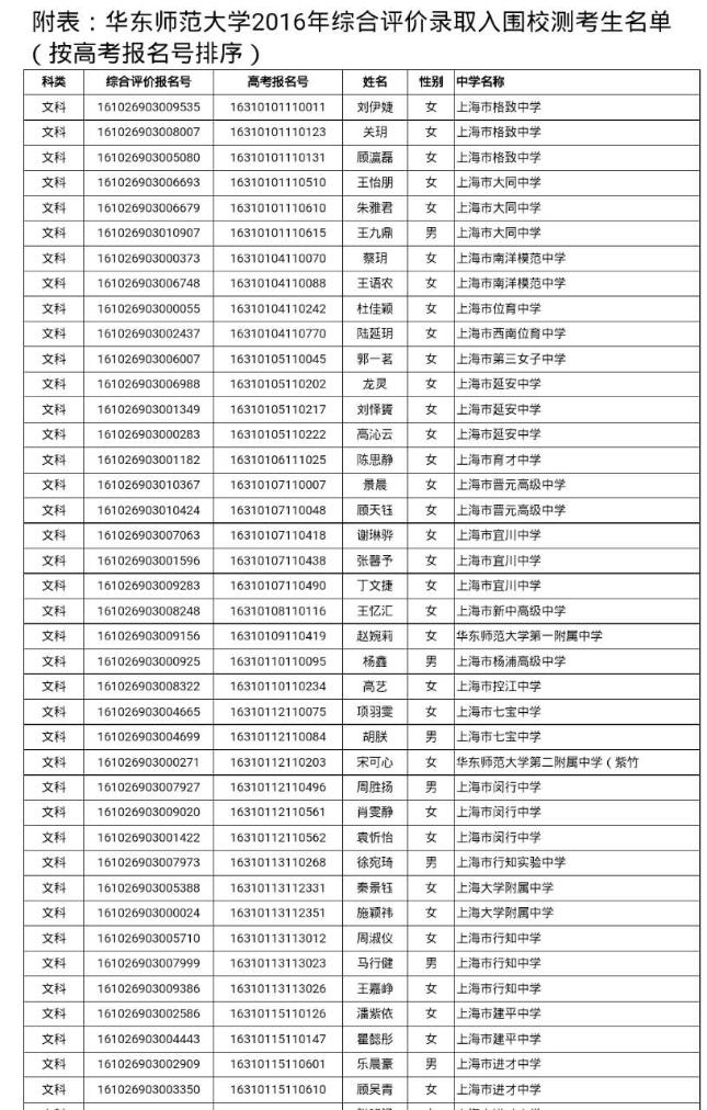 根据教育部及上海市有关文件要求,按照《上海外国语大学2016年上海市综合评价录取改革试点招生简章》的规定,我校对报名学生材料进行了严格仔细的审核,将通过初审的名单报上海教育考试院,上海教育考试院依据学生的高考成绩和志愿,按照学校招生计划数的1.5倍投档(末位同分全投),确定了入围参加我校综合评价测试的名单,现将入围考生姓名、性别、毕业中学等信息进行公示: