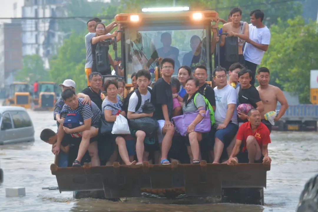积水中,铲车变身摆渡船救人,载着大家,一次又一次稳稳地驶向安全的区域。