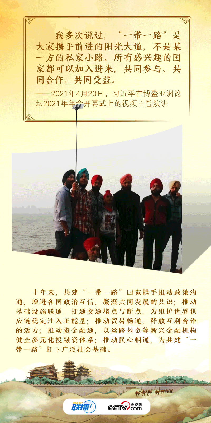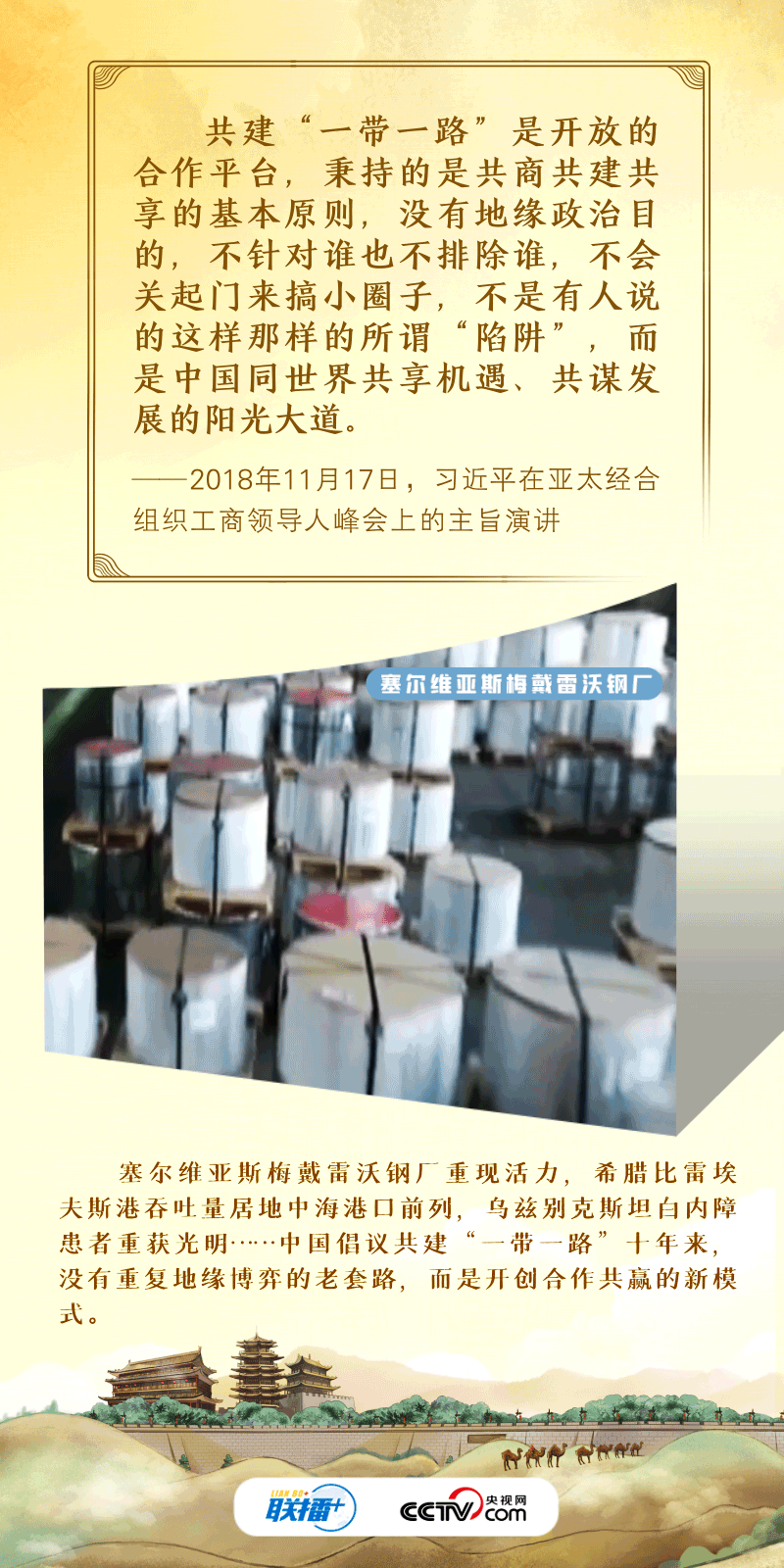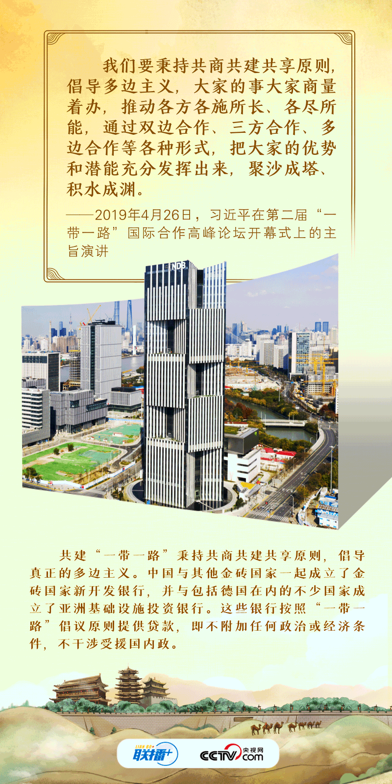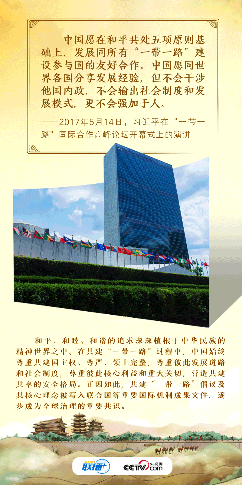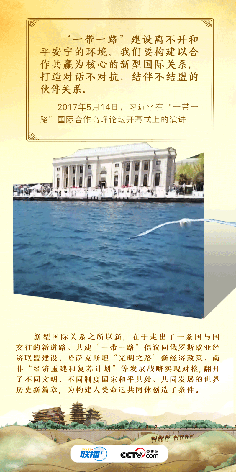 联播+“古丝绸之路绵亘万里、延续千年,积淀了以和平合作、开放包容、互学互鉴、互利共赢为核心的丝路精神。”2017年,习近平主席在首届“一带一路”国际合作高峰论坛开幕式上系统阐述了丝路精神的内涵,倡议将“一带一路”建成和平之路。