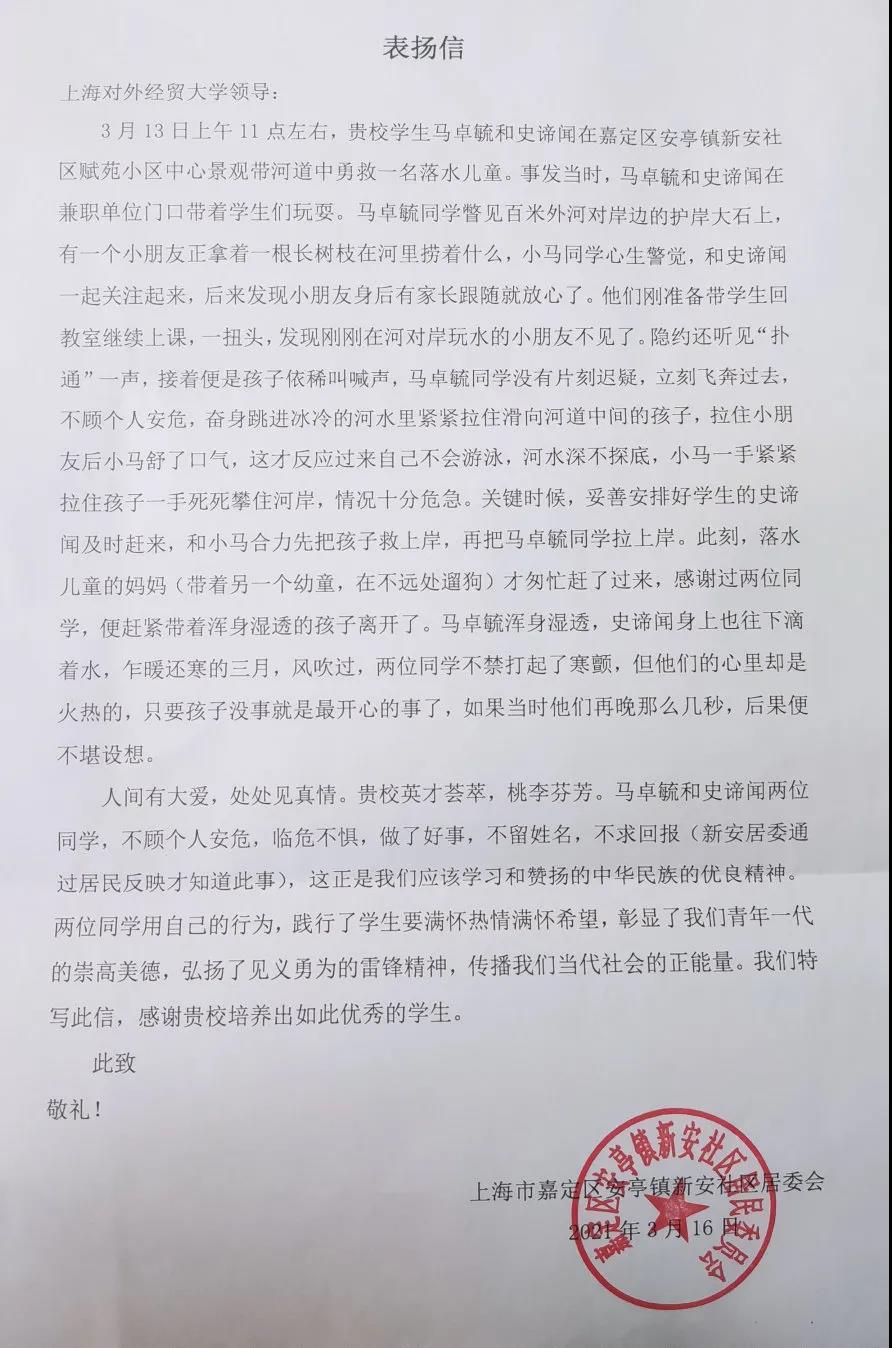 近日,上海对外经贸大学收到了一封来自上海市嘉定区安亭镇新安社区居委会的来信,表扬和感谢上海对外经贸大学统计与信息学院应用统计学专业马卓毓和史谛闻两位同学勇救落水儿童。