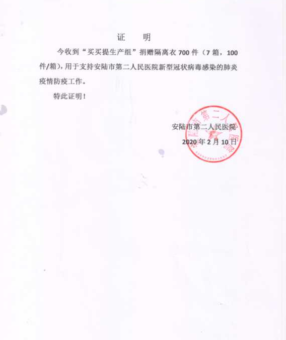 从1月31日起,我们首先瞄准了一些国外知名品牌的防护服,但都无法保证按时发货,经过多方比对,最后选择了一家国内厂商。2月10日,这批共700件的防护服,顺利送达了湖北省安陆市第二人民医院,用到了新冠肺炎的防治一线。感谢我的这群朋友,他们让我安心上了手术台,顺利迎来我家的小宝贝。